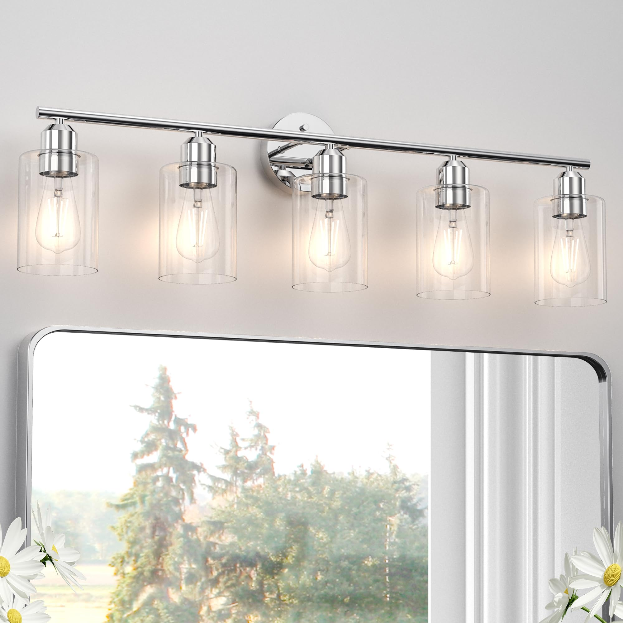 Espird Bathroom Vanity Light Fixtures Polished Chrome Bathroom Lighting Fixture, 5 Lights Bathroom Light Fixture Over Mirror, Modern Black Vanity Light, Wall Sconces with Glass Shades