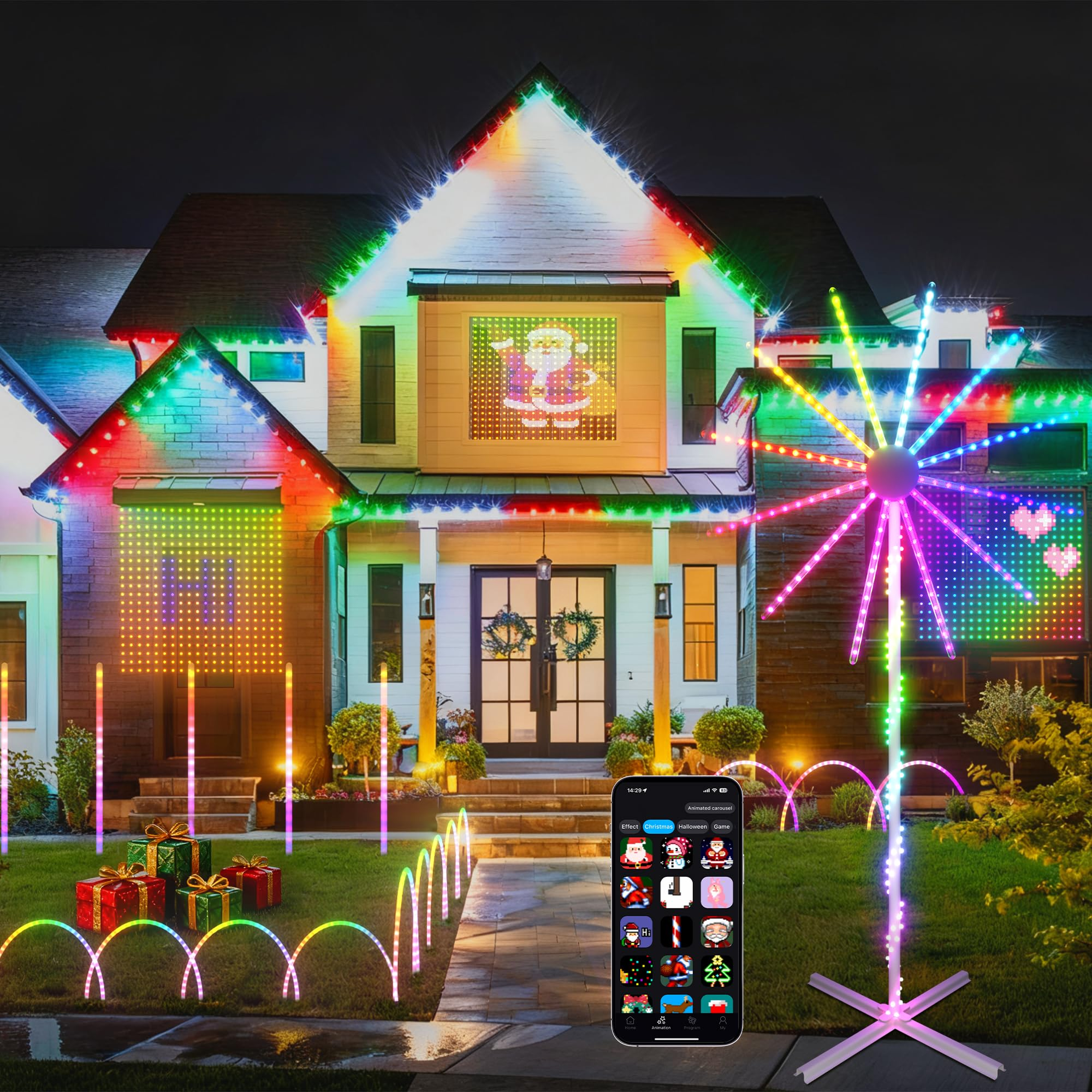 Christmas LightShow Set, 66ft Permanent Outdoor Lights, Smart Curtain Lights, LED Firework Light, Pathway Light App Control & Music Sync for Party Wedding Christmas Decorations Gifts